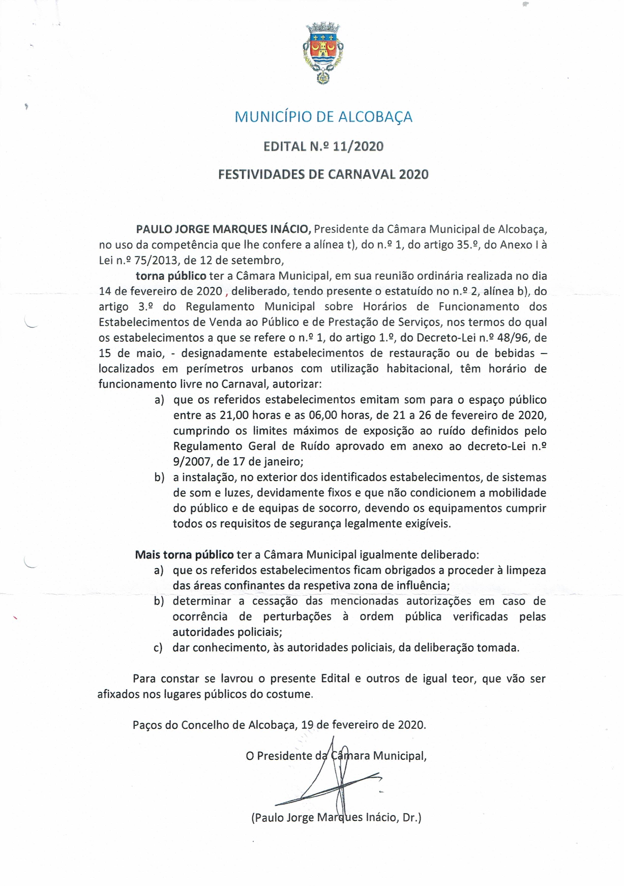 Edital sobre o horário de funcionamento dos estabelecimentos comerciais durante o Carnaval (21 a 26 de Fevereiro)
