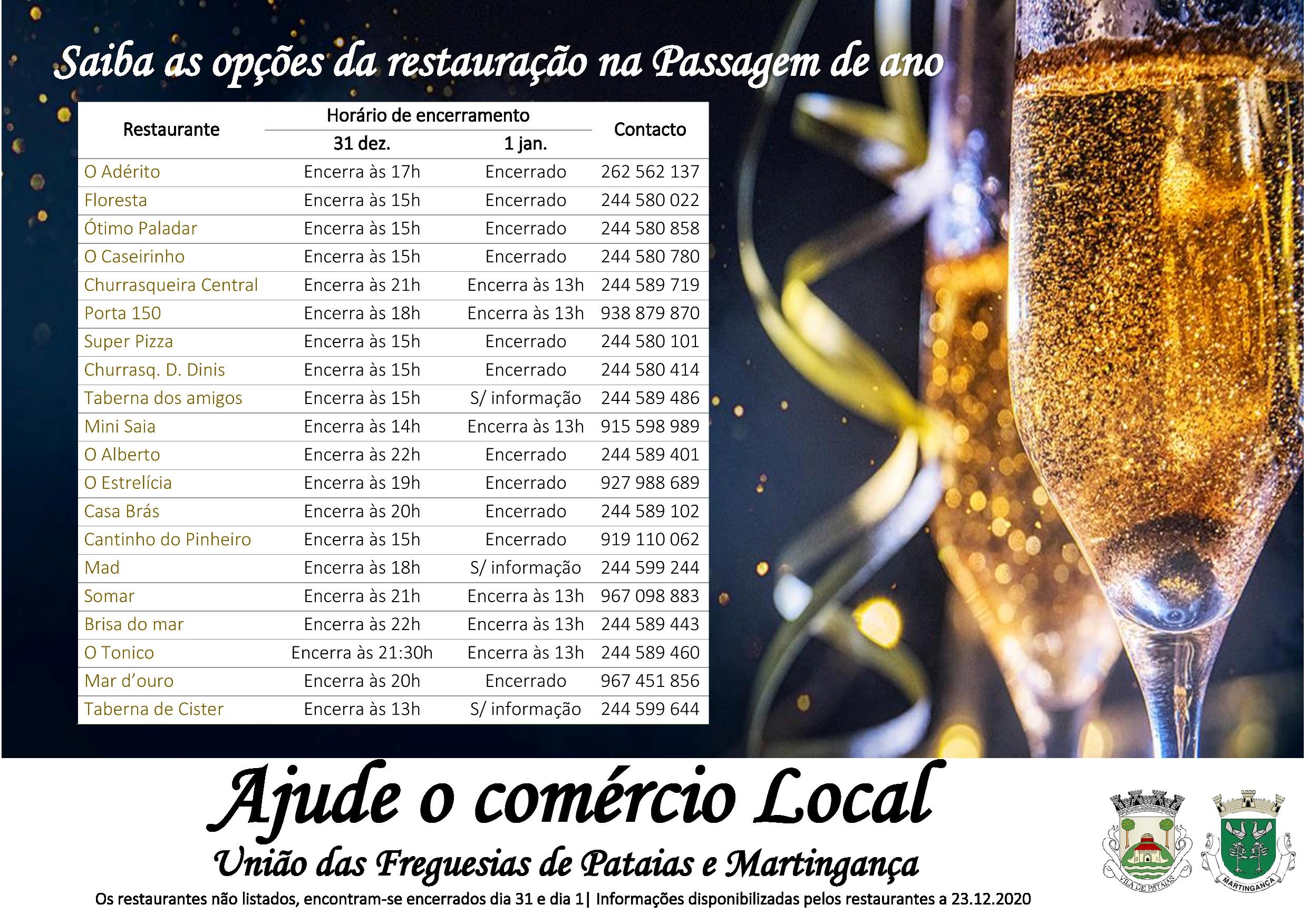 A União de Freguesias de Pataias e Martingança, disponibiliza a listagem dos restaurantes em funcionamento no dia 31 de dezembro e no dia 1 de janeiro de 2021 e respetivos contatos telefónicos. Desta forma, o executivo apela a uma ajuda ao comércio local.